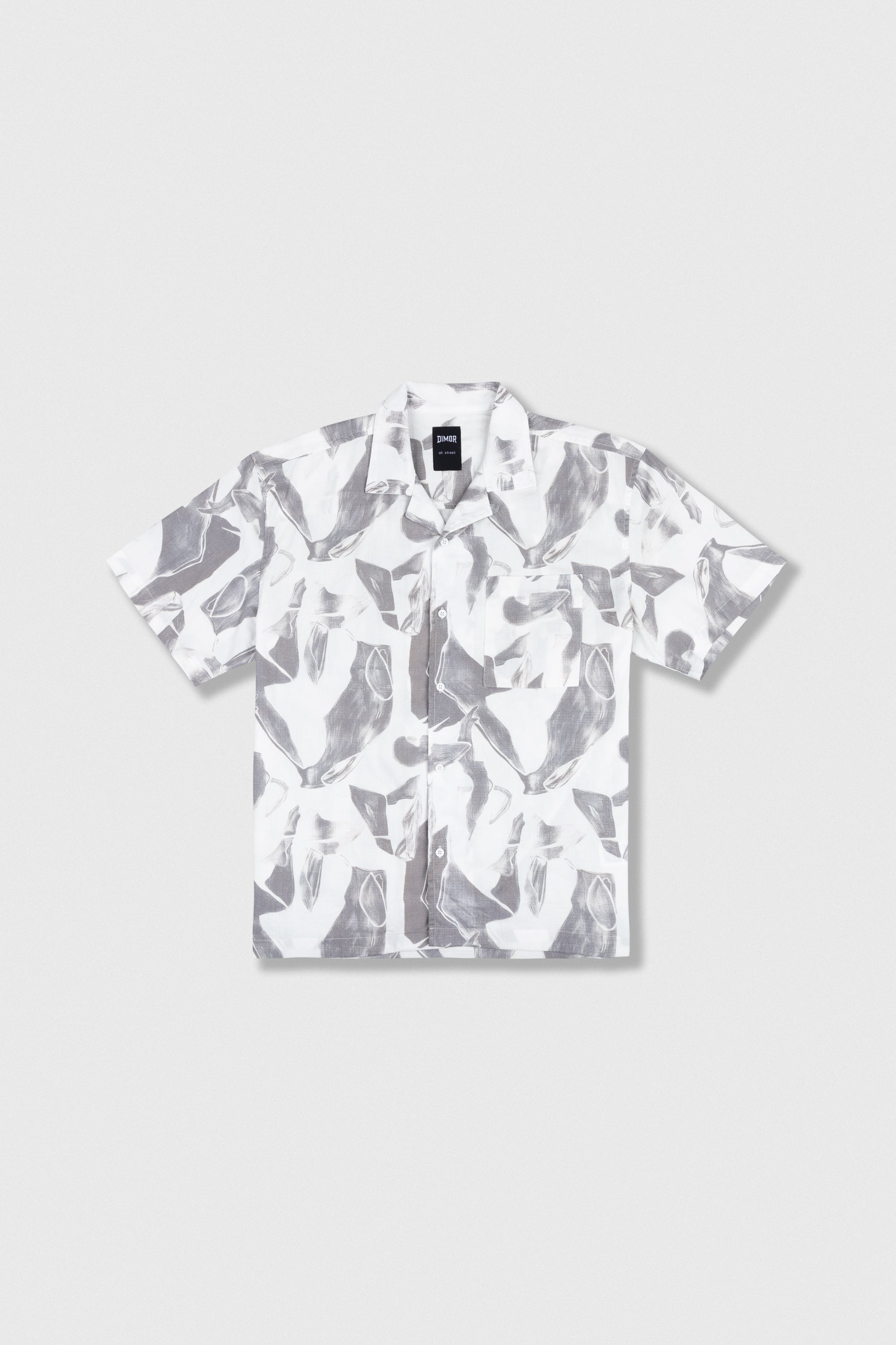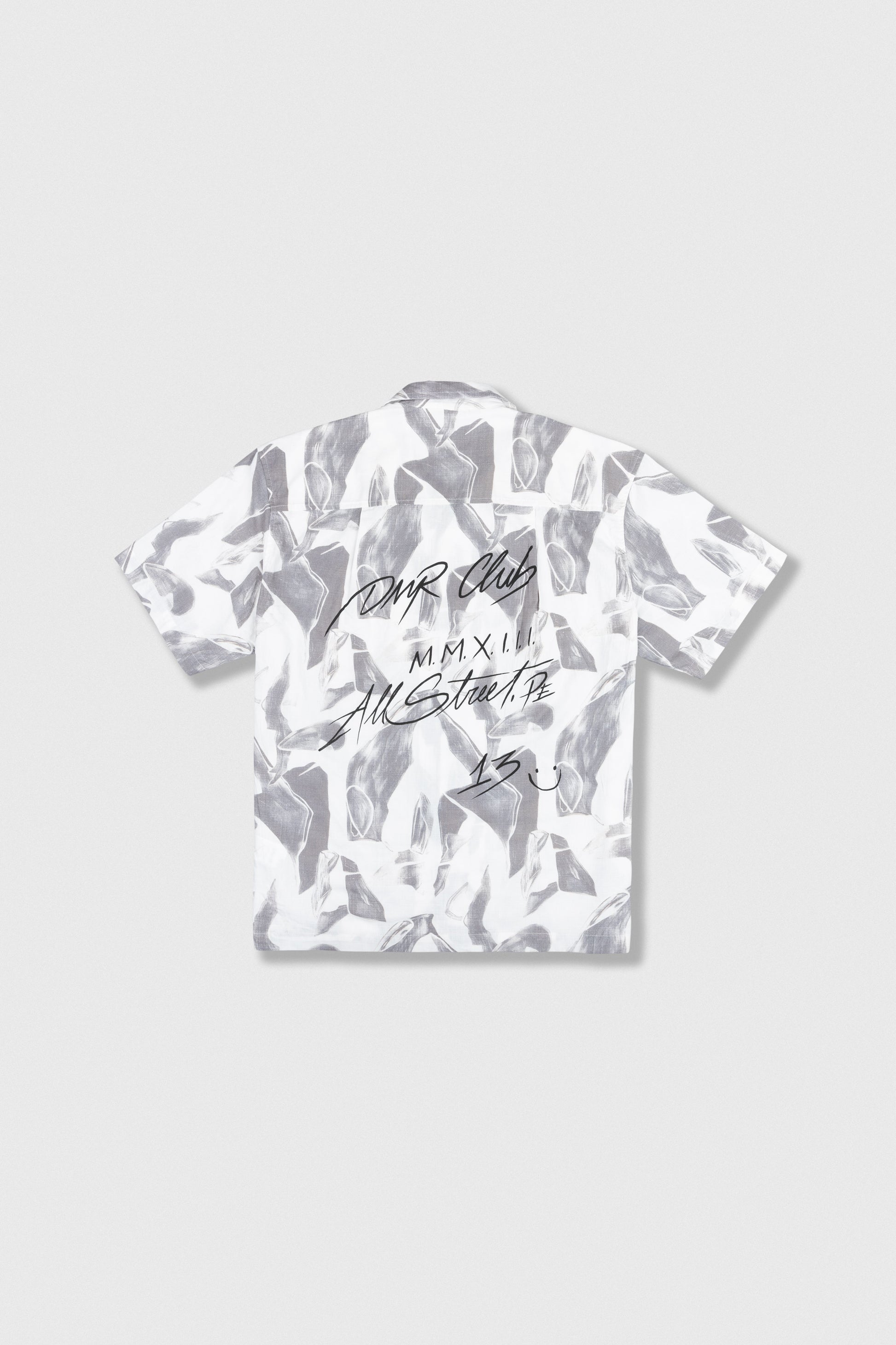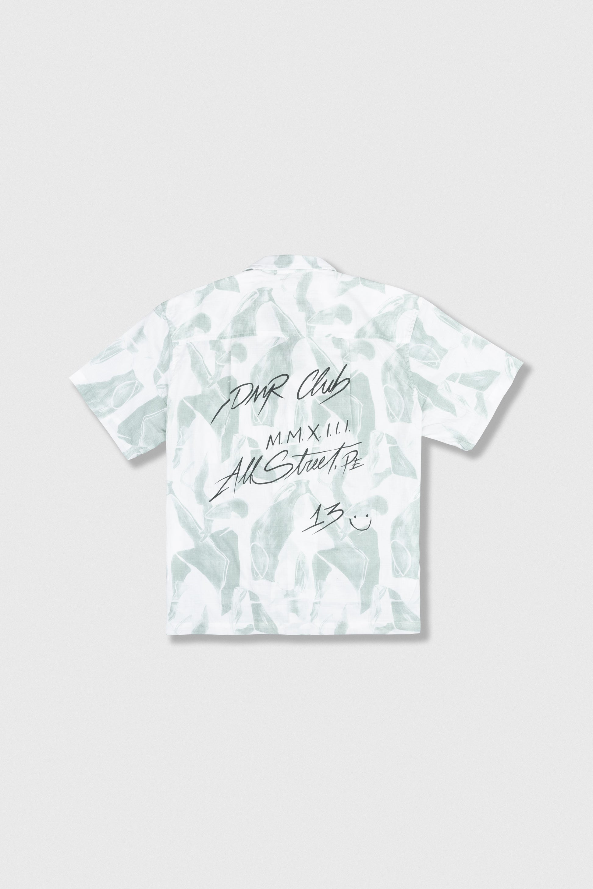Camisa de manga corta con diseño hojas que le da un toque minimalista y elegante. Cuenta con cuello clásico, cierre frontal de botones a tono, en la parte de la espalda un detalle de firma de "dmr club MMXIII, all street 13". Su estilo versátil la hace ideal para combinar en outfits casuales o semi-formales.