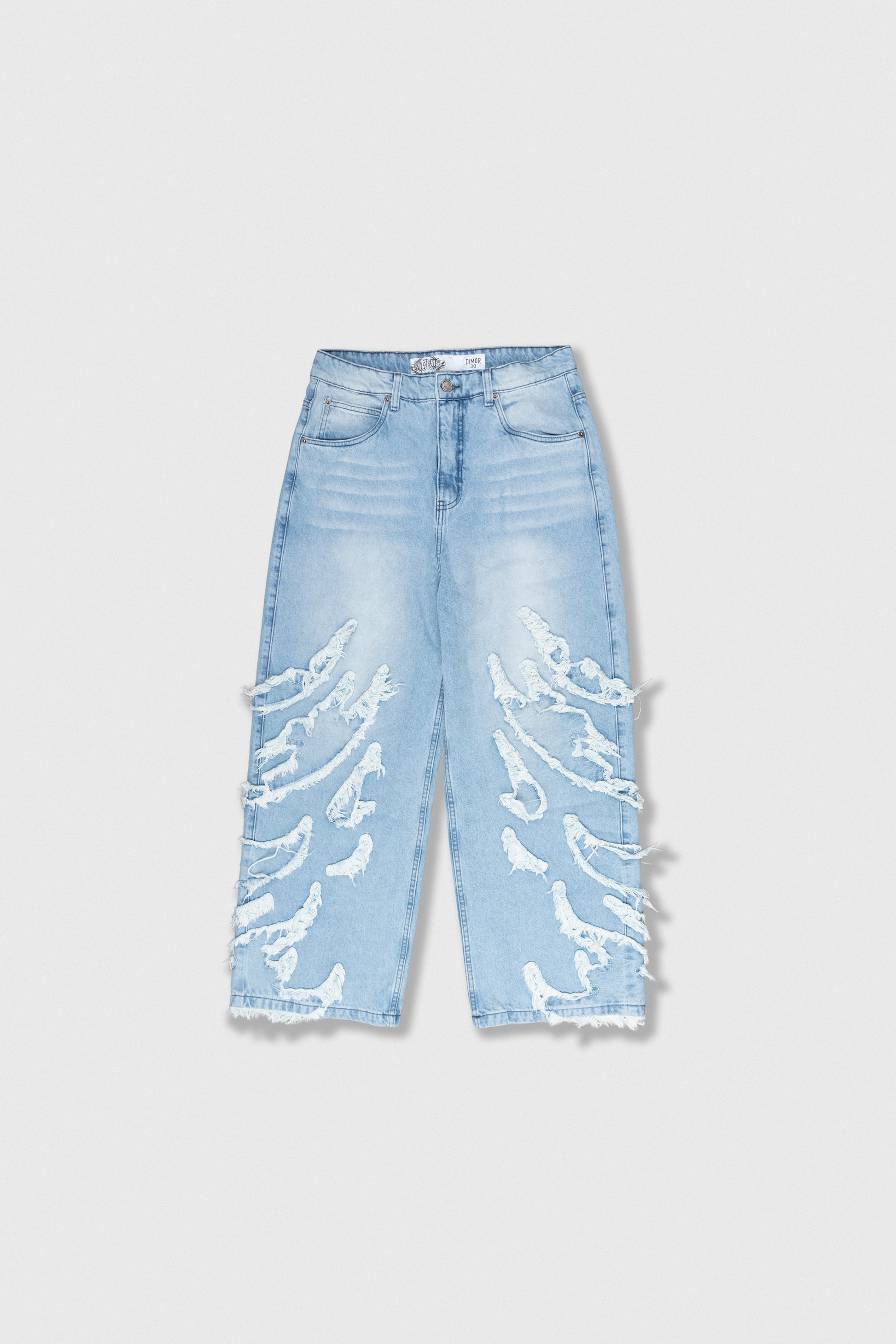 Pantalones de mezclilla, con un estilo urbano y moderno. Su diseño destaca por los rotos amplios y desgastados distribuidos en ambas piernas, creando un efecto visual único y atrevido. En la parte trasera, presentan bolsillos bordados con diseño tribal, aportando un toque distintivo y de carácter.