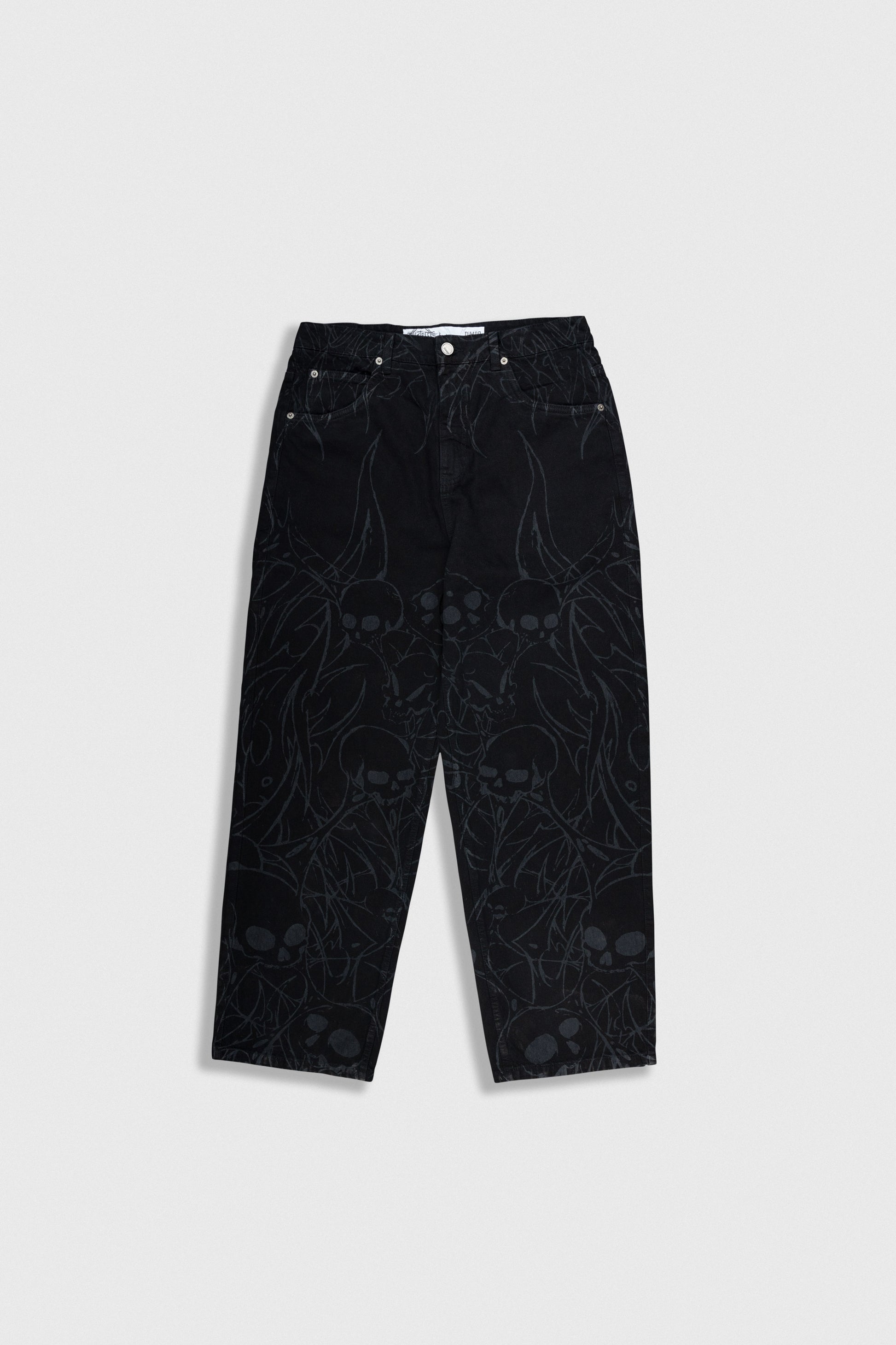 Pantalón con corte recto y estilo relajado. Presenta un estampado integral de calaveras y líneas flameantes en un acabado más claro, creando un contraste llamativo y de estética urbana con un aire rebelde. Una prenda ideal para quienes buscan un look alternativo y con personalidad.