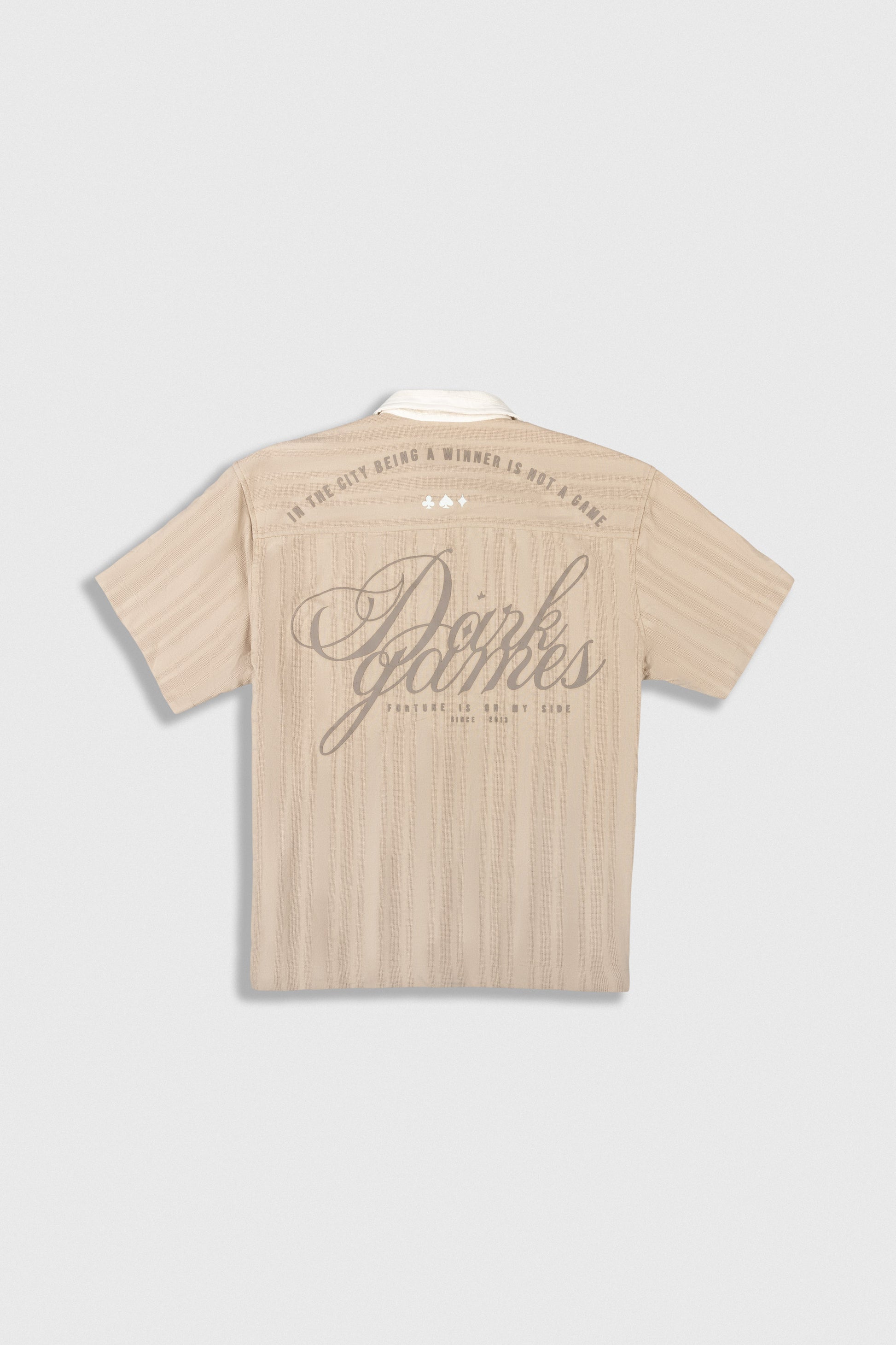Camisa de manga corta con cuello color contraste. El diseño es fresco, urbano y versátil, ideal para un look casual con un toque artístico.